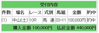 会員様情報では3倍額勝負の馬連1点指示で4.4倍的中となり、44万円獲得となりました。