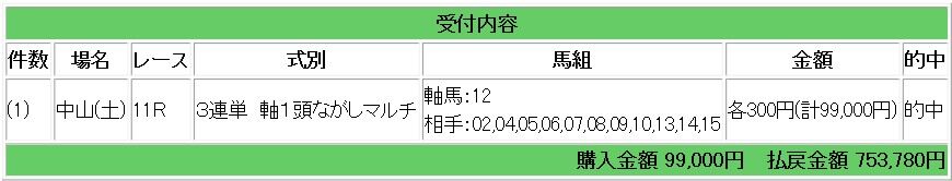 会員様には9番人気の12ロフティフレーズからの3連単指示的中となり、75万3780円の払い戻しとなりました。