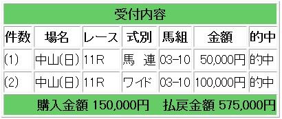 会員様情報では馬連・ワイド各1点指示でダブル的中となり57万5000円の払い戻しとなりました。