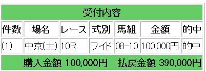 会員様情報ではアドマイヤビーナスとピクシーメイデンのワイド1点的中となり、39万円獲得となりました。