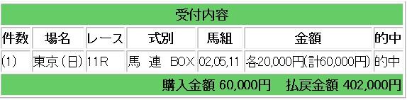 会員様には2ソングライン、5ソダシ、11ファインルージュの馬連ボックス指示で20.1倍的中となり、40万2000円の払い戻しとなりました。