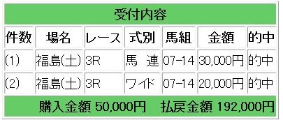 上記情報馬のワンツー決着となり、馬連4.8倍、ワイド2.4倍ダブル的中で19万2000円の払い戻しとなりました。