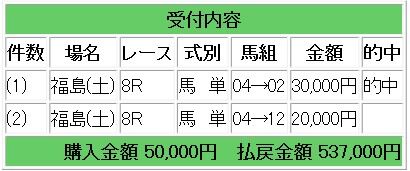 エリザベス情報杯 8ジュラルディーナから危険な人気馬3頭を外した馬連指示で19.2倍、155倍的中(2着同着)となり121万9400円の払い戻し