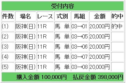会員様には予告通り3ジャンタルマンタルからの馬単5点指示で19.9倍的中となり、39万8000円の払い戻しとなりました。