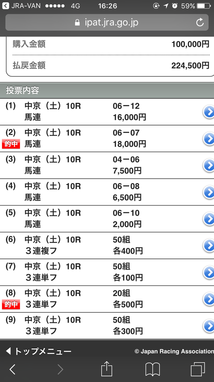 会員様には馬連・3連複・3連単での馬券指示となりましたが、馬連・3連単のダブル的中となり、22万4500円の払い戻しとなりました。