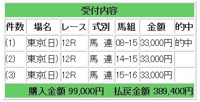 15マスカレードボールからの馬連指示で11.8倍的中となり、38万9400円の払い戻しとなりました。